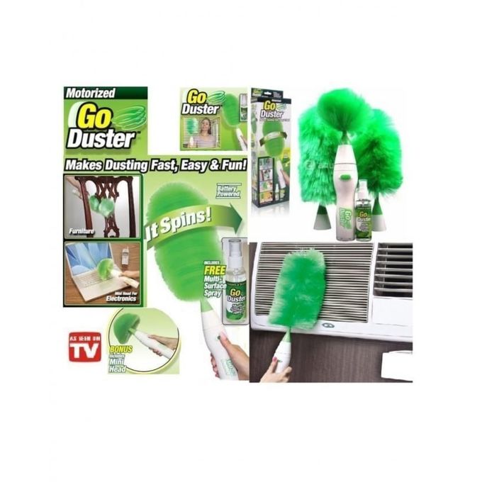 Go Duster is a revolutionary battery operated duster that allows one to clean and wipe away even those elusive dust tucked inside shelves, plants, blinds, electronics and on well-loved collectibles. Its ergonomic handle is certain to smitten young and especially adult users. Go Duster comes with a bottle of Multi-Surface Dusting Spray sure to grab and trap dust without letting them escape. Go Duster is easy to wash: simply rinse the dusting head under a faucet and dry before using it again. The Go Dust package comes with one extra long head brush, one medium head brush, one mini head brush, plus one extension handle and one storage shelf.